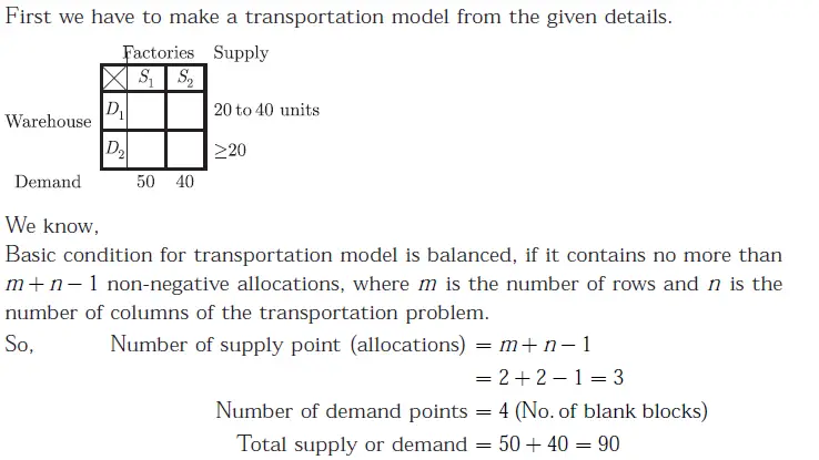 Q 74. A company has two factories S1, S2 and two warehouses D1, D2. The supplies from S1 and S2 are 50 and 40 units respectively. Warehouse D1 requires a minimum of 20 units and a maximum of 40 units. Warehouse D2 requires a minimum of 20 units and, over and above, it can take as much as can be supplied. A balanced transportation problem is to be formulated for the above