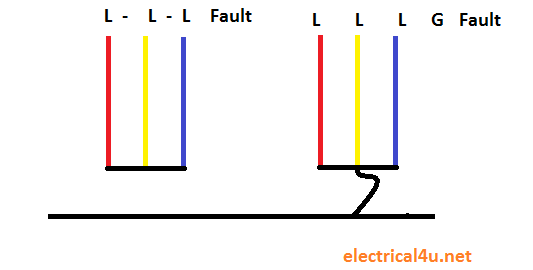 In three-phase systems, a fault may involve Ground faults (L-G, L-L-G, L-L-L-G) or Short Circuit Faults. In a “ground fault” or “earth fault”, current flows into the earth.