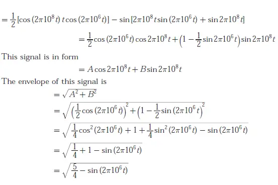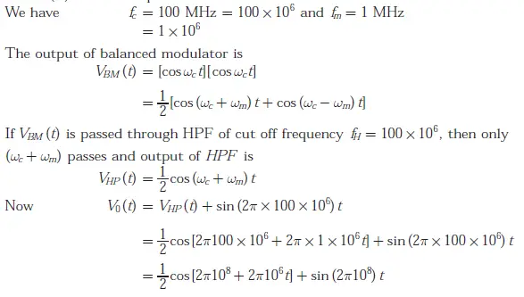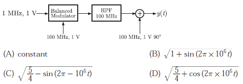 Q. 76 A 100 MHz carrier of 1 V amplitude and a 1 MHz modulating signal of 1 V amplitude are fed to a balanced modulator. The ourput of the modulator is passed through an ideal high-pass filter with cut-off frequency of 100 MHz. The output of the filter is added with 100 MHz signal of 1 V amplitude and 90c phase shift as shown in the figure. The envelope of the resultant signal is