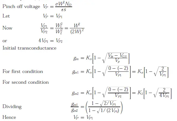 be the initial pinch -off voltage. If the width W is doubled (with other geometrical parameters and doping levels remaining the same), then the ratio between the mutual trans conductances of the initial and the modified JFET is
