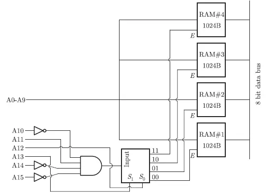 Q. 45 There are four chips each of 1024 bytes connected to a 16 bit address bus as shown in the figure below, RAMs 1, 2, 3 and 4 respectively are mappped to addresses