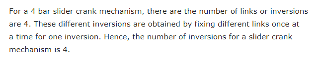 Gate Solved Gate ME-2006 Question Paper With Solutions Facebook WhatsApp Twitter Pinterest Email Q 9. The number of inversions for a slider crank mechanism is: (A) 6 (B) 5 (C) 4 (D) 3 Answer: (C) Explanation: Learn More: Gate EE-2017-2 Question Paper With Solutions