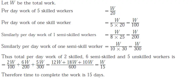Q 62. 5 skilled workers can build a wall in 20 days; 8 semi – skilled workers can build a wall in 25 days; 10 unskilled workers can build a wall in 30 days. If team has 2 skilled, 6 semi-skilled and 5 unskilled workers, how long will it take to build the wall?